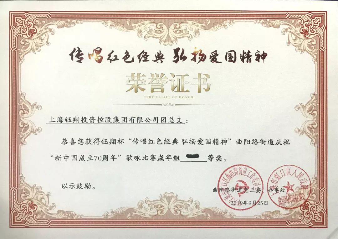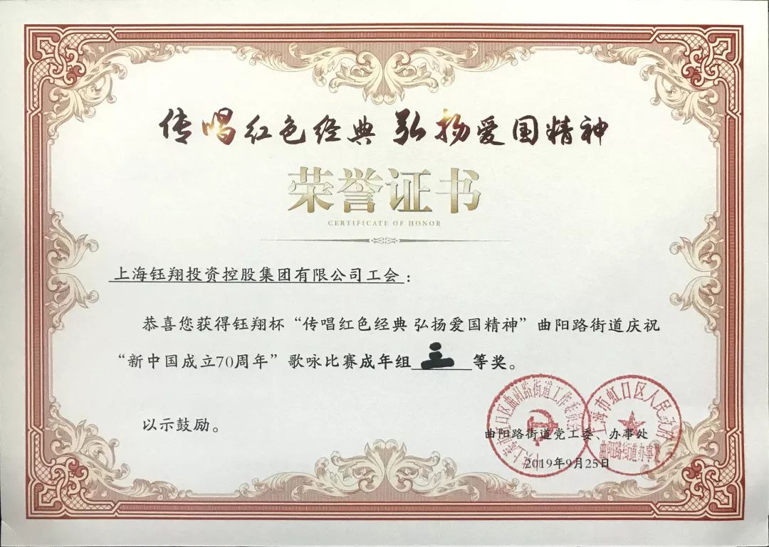 傳唱紅色經典 弘揚愛國精神——鈺翔控股集團在“鈺翔杯”曲陽路街道慶祝“新中國成立70周年”歌詠比賽中取得佳績