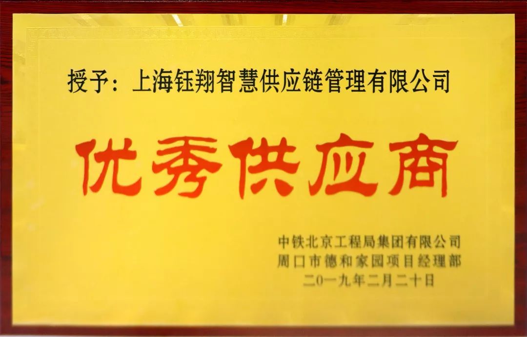 上海鈺翔智慧供應鏈管理有限公司被中鐵北京局周口德和家園項目部評為優秀供應商